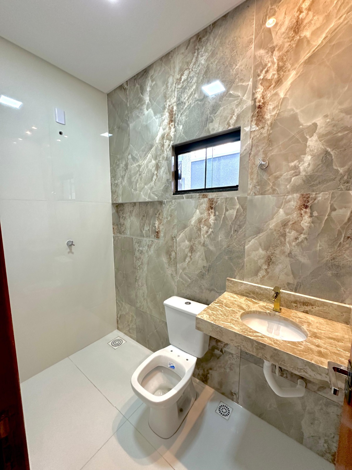 Banheiro social e da suite com nicho, bancada dos banheiros no bege bahia. Área de serviço coberta.